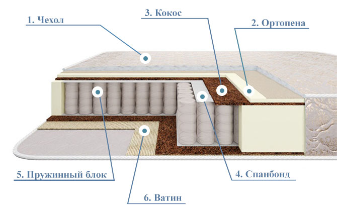 6. Ватин. Настилочный материал из полушерстяного волокна используется в качестве защитного слоя. Это экологически безопасный материал, смягчающий поверхность матраса.