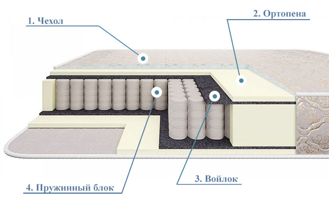 4. Пружинный блок. Классический вариант блока независимых пружин поддерживает тело в правильном положении, способствует расслаблению и отдыху организма во время сна, оказывает ортопедический эффект.