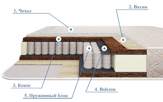 - Ватин. Настилочный материал смягчает давление пружин на тело, при этом сохраняет правильное распределение веса на поверхность матраса. Обладает теплоизолирующими свойствами, помогает сохранить комфортную температуру спального места во время сна.