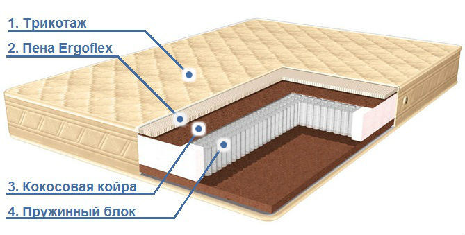- Пена Ergoflex. Высокоэластичный слой высотой 2 см смягчает поверхность матраса, принимает форму тела, мягко прогибается под его контуры. Помогает чувствовать себя комфортно при любом положении во сне.