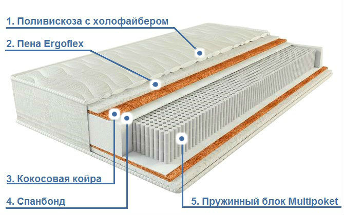- Пена ERGOFLEX (2 см). Высокоэластичный материал создает дополнительный уровень комфорта. Пена обладает отличными эксплуатационными качествами – не деформируется, не проседает в спальных местах, равномерно распределяется по всему объему матраса.