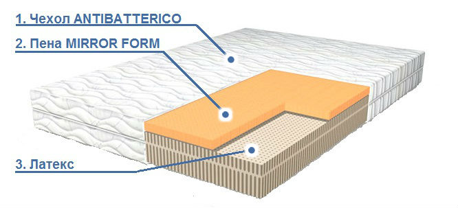 - Пена Mirror Form (4 см). Термочувствительный, автомоделируемый наполнитель, обеспечивающий естественное положение позвоночника во время сна, а также отличную циркуляцию крови. Материал легко принимает форму тела, вам не приходится переворачиваться во время сна в поисках удобного положения.