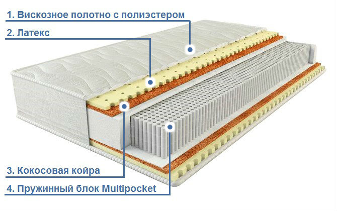 - Пружинный блок Multipocket (14 см). Позволяет плавно распределить вес на всю поверхность и разгрузить опорно-двигательный аппарат. Особенность сцепления пружин гарантирует отсутствие эффекта волны и гамака. Матрас не передает колебания на всю поверхность и не проседает со стороны партнера с большим весом. Для защиты краев матраса от деформации и быстрого износа по периметру матраса предусмотрен еврокаркас.