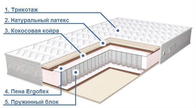 - Пена ERGOFLEX (2 см). Высокоэластичный слой наполнителя увеличивает устойчивость всей конструкции, помогает избежать деформаций и увеличивает срок эксплуатации матраса. Способствует равномерному давлению пружинного блока на ваше тело.